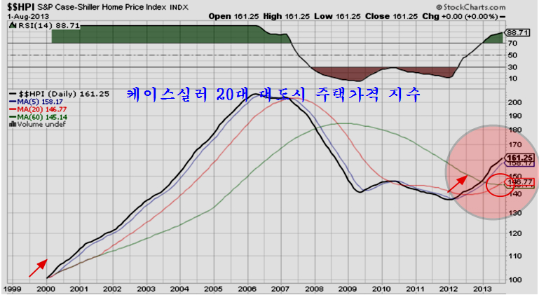 미국의 주택가격은 2012년을 기점으로 상승세로 돌아서 있으며 견실한 상승추세에 있다. 지금은 월간을 기준으로 20월 평균이 60월 평균을 돌파하면서 장기 추세 초기 과정임을 나타내고 있다.