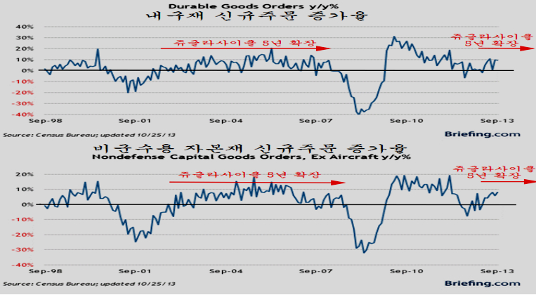 이런 경기의 흐름을 반영하면서 내구재 신규주문은 10년의 주기성을 보이고 있는데, 2010년 이후 둔화를 마무리하고 최근 다시 증가세로 전환되고 있다. 이 역시 회복이 시작되면 5년 이상 활황이 이어진다.