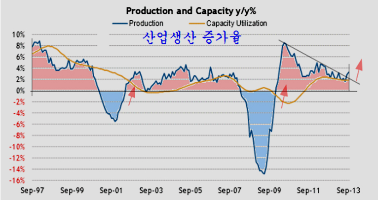산업생산 역시 회복세가 활발하다. 내구재 주문처럼 10년 주기의 변동을 보이는 미국 산업생산은 분모효과에 따른 2009년 급등 이후 2011년부터 점차 둔화되는 모습이 나타났으나 최근 이 기술적 저항을 돌파하며 새로운 확장 국면이 시작되고 있다.