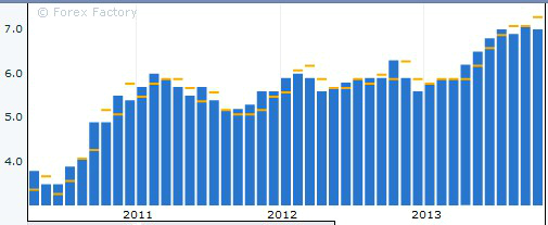 4. 미국은 제조업지수가 30년 만에 최대치가 나왔지만 민간고용과 관련해서 현재 실업률이 7.2%로 목표치인 6.5%보다 아직 높은 수준을 유지하면서 경제지표의 혼조세를 보이고 있다.