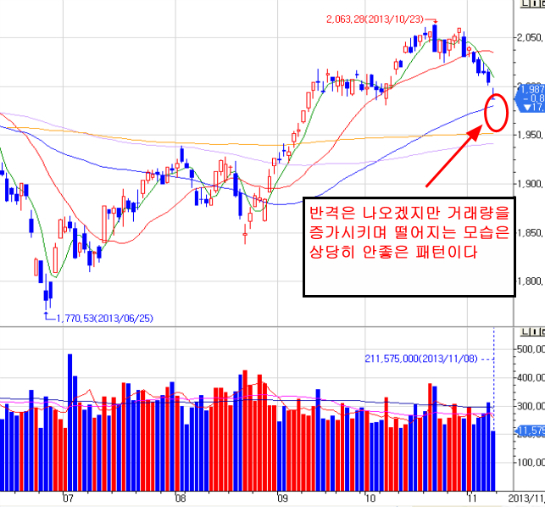 코스피지수는 이미 일주일전에 중기적 지지에 중요선인 20선을 깬 상황이다.