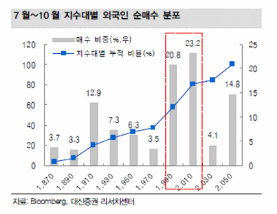 그렇지만 위의 표를 보시면 7월이후 외국인 매수세의 44%는 1980~2020선에 집중되어있어 외국인들 역시 1980선이 무너지는걸 쉽게 두고만 보지 않을 것으로 보입니다. 또한 각국의 경기선행지수가 상승세를 지속하고 있는데, 특히 빅3라 볼 수 있는 미국,유럽,중국의경기선행지수가 동반 상승이 예상되는 점에서 이번 매도세가 오래 지속되지는 않을 것으로 보입니다.