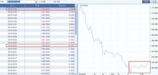 첫째, 환율 하락세가 제한적 반등으로 주춤하는 흐름을 나타냄에 따른 외국인의 일정부분 환차익 욕구 발생이다. 위에 나타나듯 원/달러 환율은 10월 23일 1,055.80원을 기록한 이후 11월 8일 종가 1,064.90원으로 소폭 반등을 나타냈다. 12거래일 동안 환율 하락세가 주춤함에 따라 조선주에서 유럽계 자금의 매도가 먼저 나타났고 뒤를 이어 시장 전반으로 외국인 매도가 일정부분 나타난 부분이 환차익 욕구가 일정부분 발동된 것으로 해석된다.