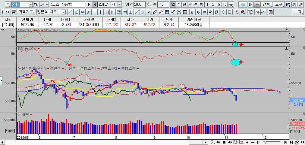 주요 지지선 이탈 =>500선 이탈은 기정사실 설사 깨지 않고 반등이 나오더라도 시원스러운 반등은 기대하기 어렵습니다.
