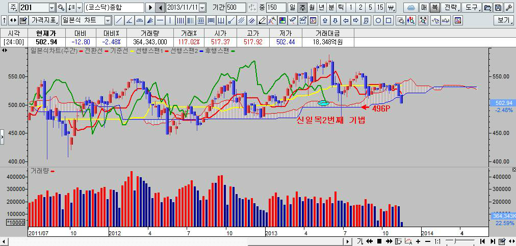 => 추가적 하락이 나오게 되면 주봉상 일목에서는 496P / 월봉에서도 496P 공포구간에 매수진입 자리