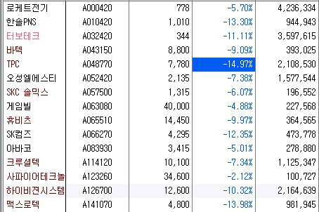 코닥 종목들은 수급이 없고 고객예탁금 15조원붕괴 ==> 작은 물량만 가지고도 대부분의 종목들이 추풍낙엽 입니다.