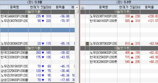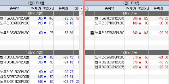 옵션,ELW시장은 당월물 등가나 내가 콜은 +50%, 약외가 콜은 +80%정도 올라서 마감하였고