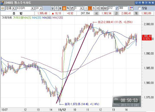 2013년 11월 12일 화요일에 코스피 지수는 전일 종가 1977포인트보다 0.92%오른 1995포인트로 마감하였습니다.