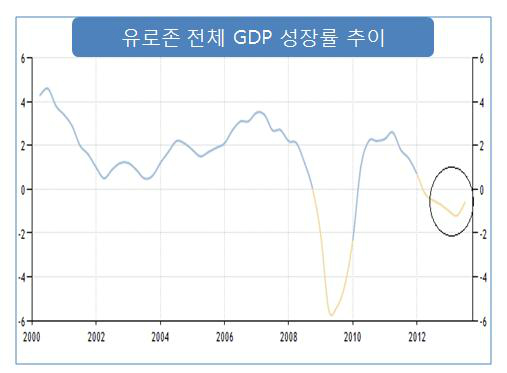 유로존도 마찬가지다. 그림에서 보듯 상승하던 인플레이션이 다시 꺽이고 있는 모습이다. 유로존 위기 이전과 비교해도 낮은 수준이다. 이런 가운데 PMI 지표나 GDP 성장률 등 유로존 경기 지표들도 호조세로 반전되고 있다.