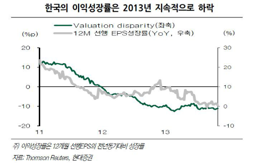 한국 기업의 평균 이익성장률이 감소하는 가장 근본적 이유는 업황 둔화도 있지만 환율의 하락세가 주된 원인이다. 그리고 환율 하락에 대한 반영은 이미 충분히 이뤄지고 있다고 보여진다. 한국 기업의 실적 전망치 하향은 3단계에 걸쳐 이뤄졌다. 환율 반영을 거치며 실적 전망치 하향이 수차례 이뤄졌다는 것은 향후 기업 실적에 대한 기대치가 그만큼 낮아져 있다는 의미다.