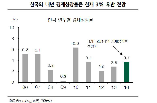 그러나 선진국 경제가 본격 살아나게 되면 수출 지향적 한국의 상황은 반드시 후행적으로 좋와지게 되어 있다. 이를 감안해 주요 상장 기업의 분기별 이익 추정치도 올해 이후 회복세를 나타낼 것으로 전망되고 있고 IMF가 내놓은 내년도 한국의 경제성장률도 올해 대비 증가다.