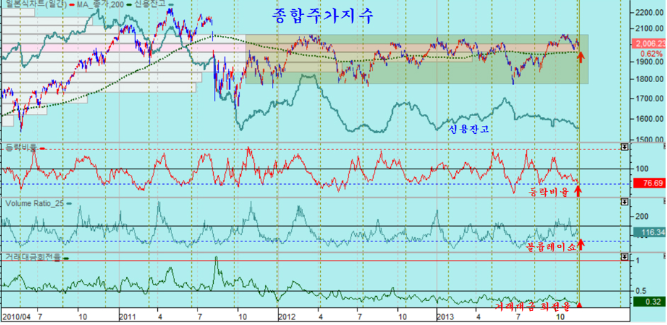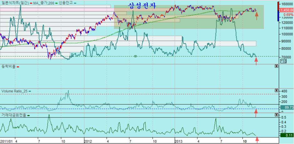 그러나 지수를 움직이는 기업의 핵심인 삼성전자가 200일 평균 지지권에 접한 가운데 신용잔고, 매물지표, 거래대금 회전율 등 중기 저점권에 있어 상승이 쉽다.