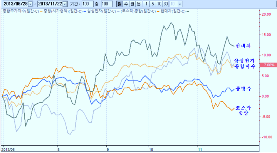 지수는 등락을 하지만 그 원인이 파생상품 시장과 관련이 되기 때문에 지수의 변동은 특히 삼성전자와 현대차 등 지수에 영향력이 커서 지수를 쉽게 움직이는 기업을 중심으로 변동이 나타나고 있다.