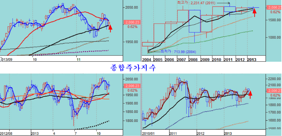 종합주가지수는 재차 60일 평균에 다가서 쌍바닥 상승을 준비하는 가운데, 죽가지수는 월봉 시가기준 3일 이평선 근처에 머물러 있어 여전히 11월 바겐세일 매수 조건을 만족하고 있다.