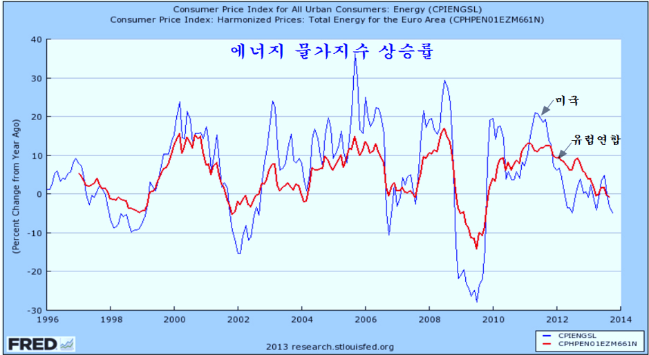 미국의 물가지수 역시 유럽과 같은 모습으로 그 중심에 원유를 비롯한 에너지 가격의 하락에 있다.
