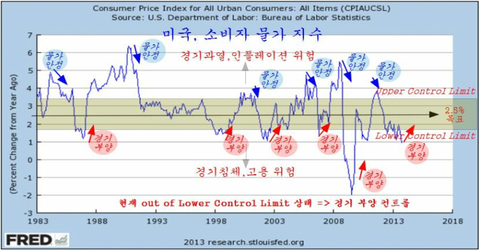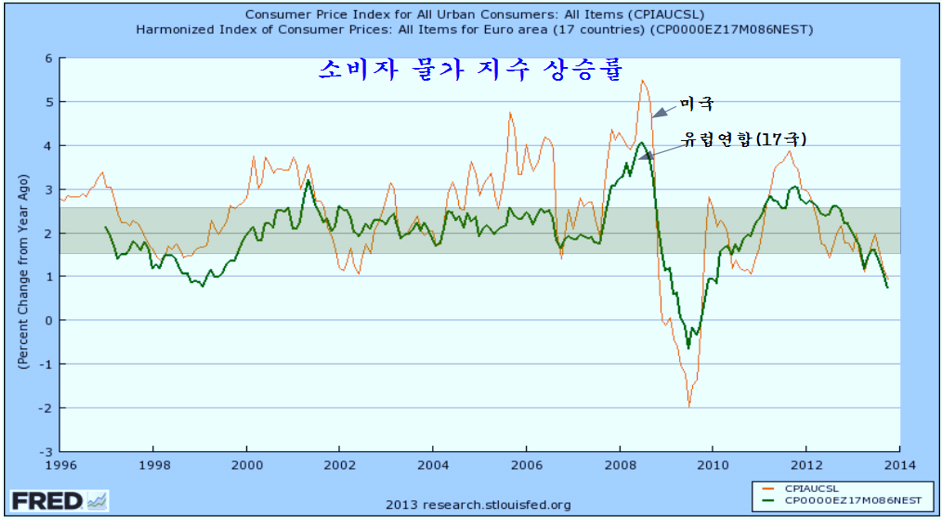 최근 들어 세계 각국의 소비자 물가 지수가 과도하게 낮게 나타나고 있다. 특히 미국과 유럽 17개국의 유럽연합의 소비자 물가지수를 보면 통상 관리 범위인 2.5%의 목표를 기준 상하로 1% 정도의 관리 범위를 아래로 이탈해 있다.