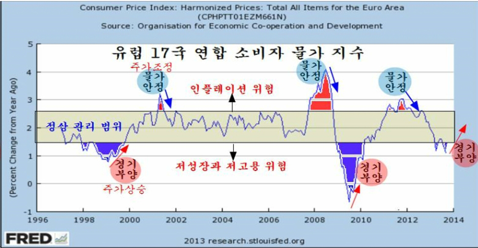 이러한 물가 관리 이상 상태는 유럽 17개국을 아우르는 유럽연합도 마찬가지이다. 물론 한국이나 여타 많은 나라들이 이와 유사한 모습이 되어 있다. 따라서 향후 경기부양 정책과 함께 주가 장기 상승과 위축되던 경기의 확장으로의 전환을 기대할 수 있다.