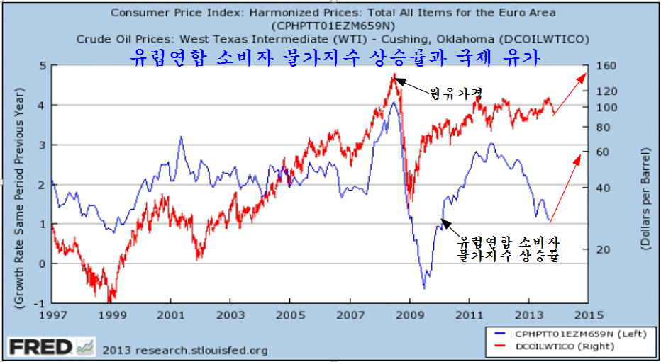 유럽연합의 소비자 물가지수 상승률을 국제 유가와 비교하여 보면 매우 밀접한 관계를 가지고 움직이는 것을 알 수 있다. 따라서 유럽연합이 경기 부양의 통화정책을 가져가면서 물가지수가 상승한다며 유가 역시 상승하게 된다.