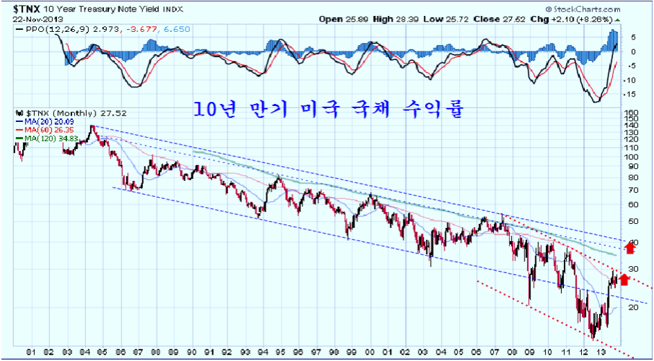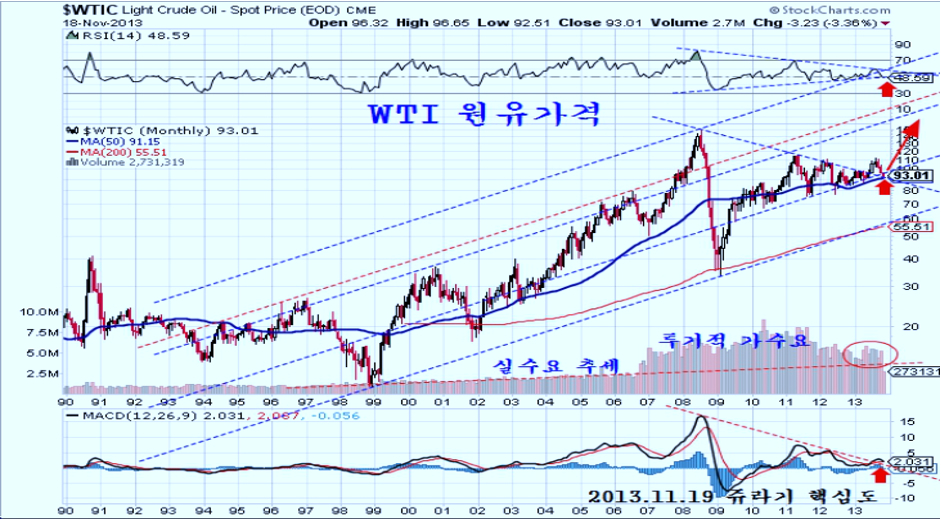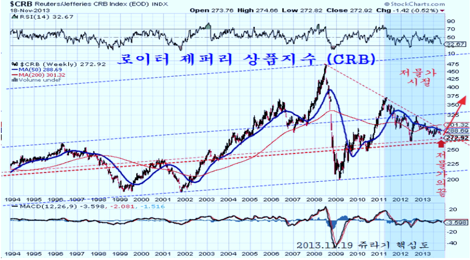 그러나 상품지수의 장기 추세 분석을 해 보면, 전체 채널 변동 구간 중 1/4가 되는 위치로 대세 추세의 전환이 나타나는 가격대이다. 따라서 2008년을 고점으로 5년간에 걸쳐 장기로 진행되어 온 상품 가격 조정은 2009년 저점에 이어 2013년 저점으로 쌍바닥을 이루어 장기로 상승하는 국면이 되기 쉽다.