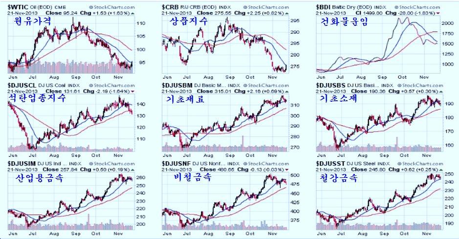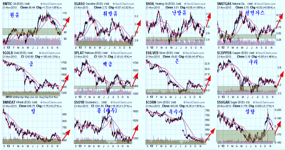 원유가격과 상품 가격은 지난 목요일 의미 있는 상승으로 상승 출발 모습을 보이고 있다. 특히 휘발유 가격이나 난방유 가격은 이미 11월 초부터 상승 추세를 보이고 있어 에너지 가격 상승세는 이미 시작되어 있다. 아울러 귀금속과 금속, 곡물 가격도 지지권에 이르면서 상승 전환을 준비 중이다.