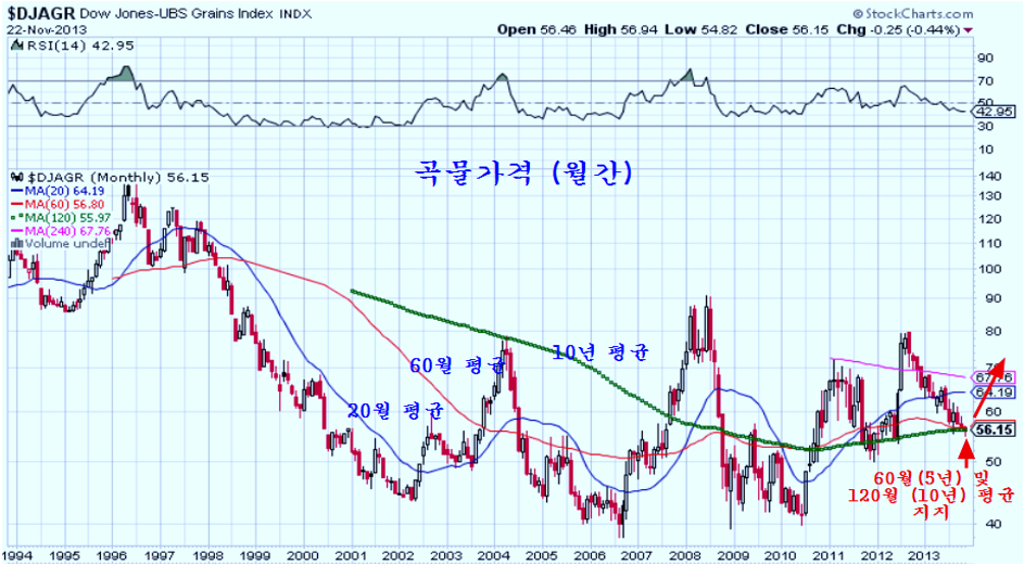 2010~2011년 이상 기후로 흉년이 들면서 크게 올랐던 곡물 가격도 2012년 작황 개선과 함께 곡물 가격이 장기 하락을 이어왔다. 그러나 곡물 가격이 월봉을 기준 5년 평균인 60월 평균선과 10년 평균인 120월 평균에 이른 만큼 더 하락하지 않고 상승으로 전환될 시점이다. 점차 인구가 증가하는 상황에서 곡물가격이 10년 평균 가격보다 하락할 이유가 없기 때문이다.