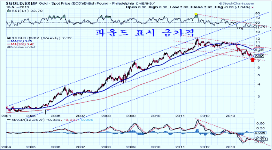 상품지수의 비중이 상당한 귀금속 가격도 2011년 7월 고점으로 가격이 박스권에 머무른 후 2013년 하락이 이어져왔다. 런던 금시장의 영향력을 감안하여 파운드화를 기준한 금값을 보면 지금은 하락이 마무리되고 재차 장기 하락을 전환될 전환점에 해당한다. 따라서 금과 은 등 귀금속 역시 하락 추세가 장기 상승으로 전환될 시점으로 매수 전략이 좋다. 산업금속 역시 마찬가지이다.