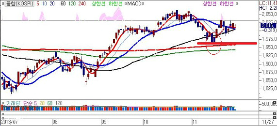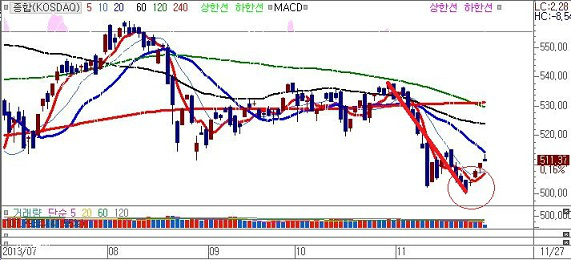 코스닥의 경우에도 주요 지지선을 이탈한후 반등국면을 모색하고 있는 모습으로 연말 증시에 대한 기대감이 아직 살아있는 모습이라 할수 있다