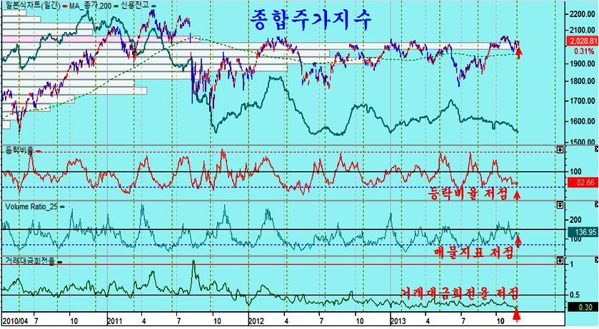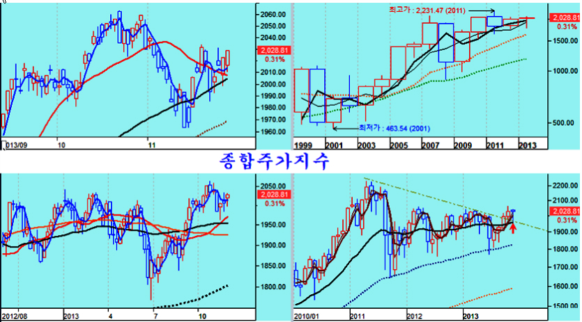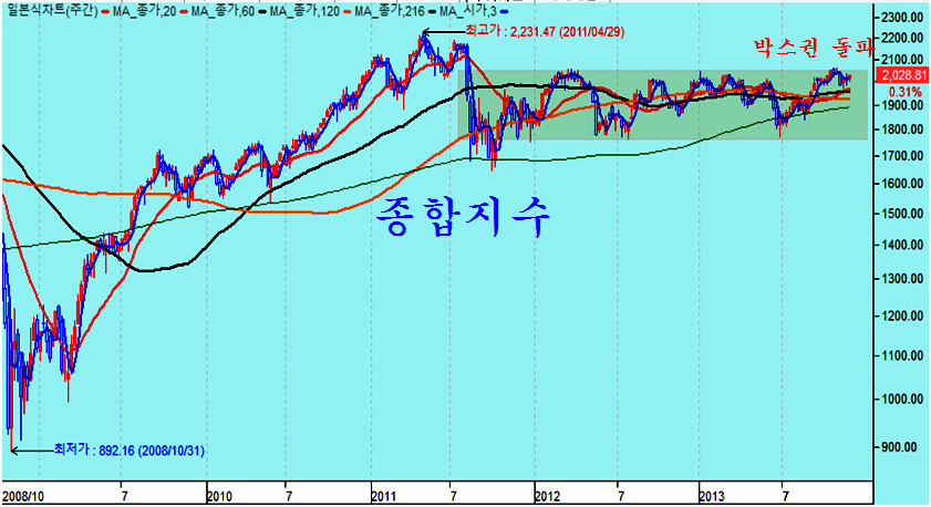 종합주가지수가 박스권 상단 돌파를 앞두고 치열한 공방이 전개되고 있다. 오늘도 지수는 약세 출발을 하였으나 외국인의 선물 매수와 함께 종가가 강하게 마감되면서 종합지수는 0.31포인트 오른 2028.81을 기록했다. 이미 월봉에서 2011년 이후의 하락의 저항추세를 돌파하여 상승이 전개되고 있어 2년 반의 지루한 박스권을 마치고 본격적인 상승 추세를 준비하고 있다.