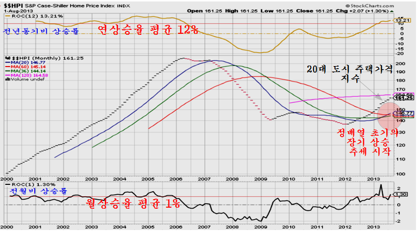 한편, 미국의 20대 도시의 주택가격 지수는 8월을 기준 전월비 1.3%, 전년 동기비 13.21%가 올랐다. 2012년 이후 지속된 상승세는 2013년 들어 2000년 ~2006년의 부동산 호황기와 같은 월평균 1%, 연평균 12%대의 상승이 진행되고 있다.