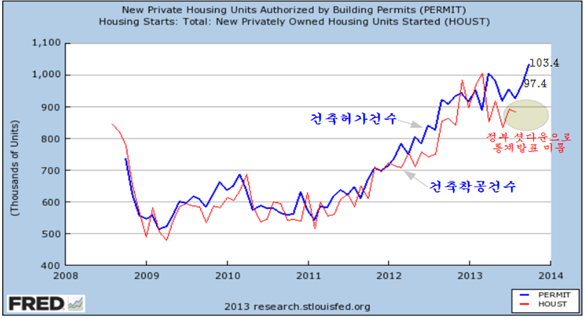 미국 정부의 셧다운과 함께 통계 발표가 지연되던 미국의 건축 허가가 발표되었는데 9월 연율로 97만채와 10월 103.4만채 허가로 금융위기 전인 2008년 상반기 이후 가장 많은 주택 허가를 기록했다.