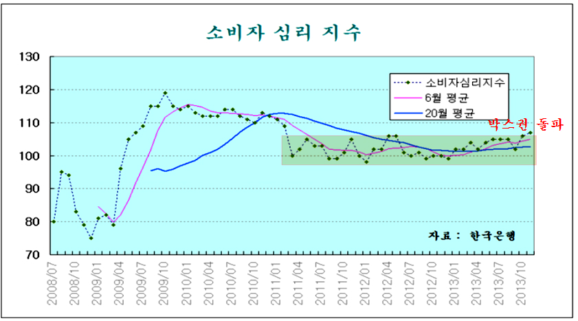 소비자심리지수가 2011년 하반기 이후의 지루한 박스권을 돌파한 만큼, 주가 역시 2011년 이후의 지루한 박스권을 돌파할 모메텀이 마련되었다고 할 것이다.