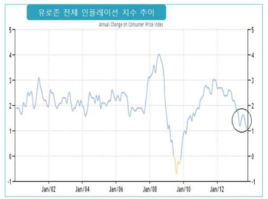 유로존도 마찬가지다. 유로존 위기 이전보다 낮은 수준의 인플레이션을 나타내는 가운데 경기지표가 회복세를 나타내고 있다. 2년간 지속 상승했던 유로존 실업률이 정점에 도달하며 감소로 전환되는 맥점을 나타내고 있다는 점은 미국이 실업률 감소 전환 이후 증시가 역사적 신고가를 갱신해가고 있는 상황과 비교시 유럽 증시의 강력한 추가 상승 시그널이다.