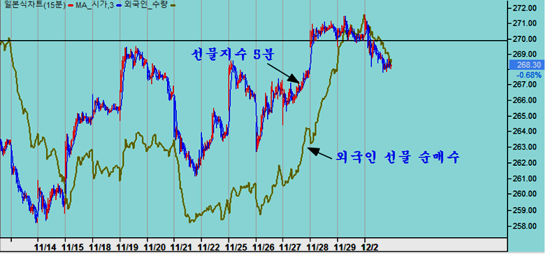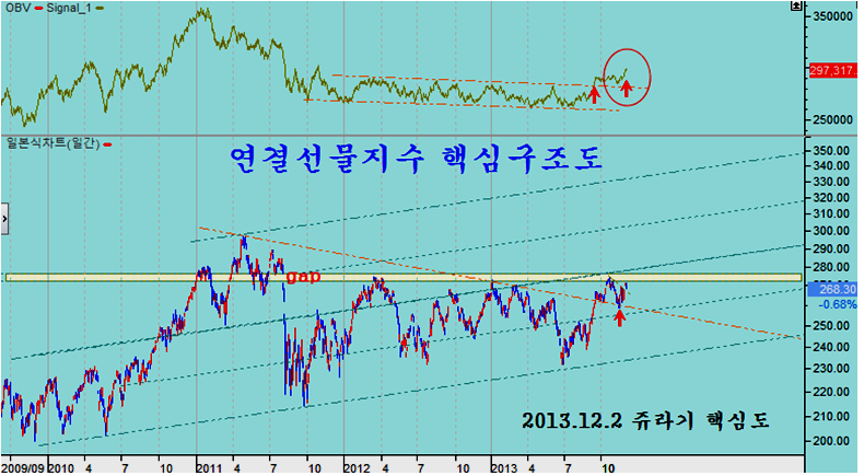 연결선물 지수는 270 전후에 있는 과거 갭을 돌파하기 위한 체력 비축과정에 있으며, 조만간 이 갭을 돌파하여 2년 반에 걸친 기나긴 박스권 장세를 마감하고 장기 상승 추세로 진입하게 될 듯 하다. 주가 상승에 선행하여 움직이는 선물 OBV 지표가 다시 고점을 돌파하여 장차 주가가 박스권을 위로 돌파하게 된다는 힌트를 주고 있다.