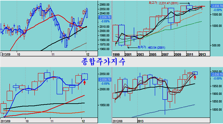 이 결과 종합주가지수는 주봉 시가 3선과 월봉 시가3선을 아래에서 마감함으로써 주중 및 12월 월중 최저가격 매수 조건을 만족하고 있다. 주가의 추가 조정 여부에 관계없이 월봉을 기준한 시가 3선이면 월중 최저가격에서 매수할 수 있는 기준으로 적극적인 매수 전략이 된다.
