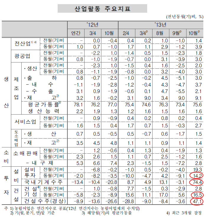 10월 산업활동 주요 지표를 보면, 9월 추석 연휴로 위축되었던 산업 활동이 회복되는 가운데 특히 설비투자와 건설 투자가 가파른 회복으로 나타나고 있다.