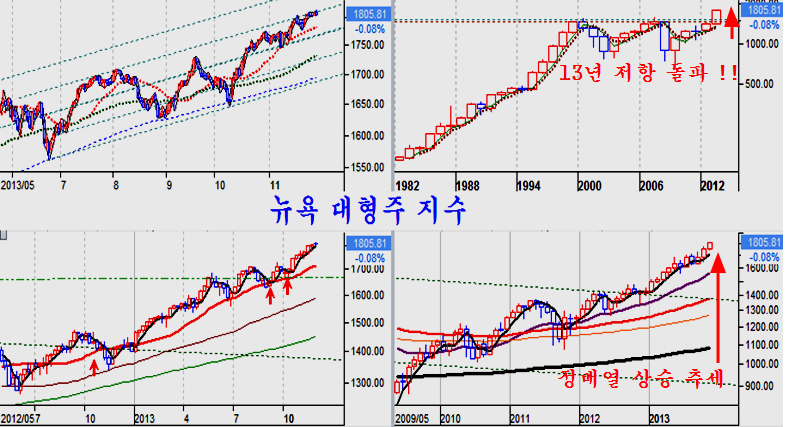 뉴욕 종합주가지수는 그간 숫한 천정이라는 설이나 버블이라는 주장에도 불구하고 2011년 10월 저점으로 견실한 정배열 상승 추세가 길게 이어지고 있다. 추세가 시작되면 고점이 어디인지 쉽게 알 수 없으므로 추세는 무릎에서 판단하고 하락하는 추세는 어깨에서 판단하는 법이다.