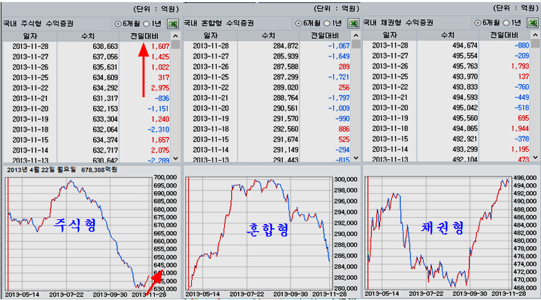 10월까지 주식형 수익증권이 집중 환매가 진행되었지만, 11월 이후에는 환매가 줄고 오히려 국내 투자 주식형 펀드의 유입이 가속되고 있다. 11월 22일 이후 5일 연속 국내 투자 주식형 펀드가 순유입 되고 금액도 6000억 원에 이르고 있다.