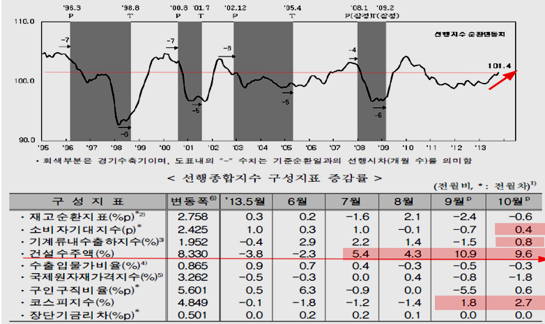 한편, 향후 경기를 예고하는 경기선행지수도 특히 건설수주액 증가와 기계류 내수 출하지수, 소비자 기대지수 및 주가지수 상승에 힘입어 가파르게 증가하고 있다. 경기선행지수 순환 변동치는 101.4를 기록함으로써 2003~2005년의 회복시 보다 훨씬 빠른 증가 추세를 보이고 있다.