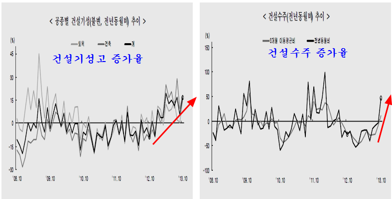 한편 장기간 침체를 보여 온 건설수주는 전년 동월비 47.1% 폭증을 하면서 2011년 이후 위축된 모습을 드라마틱하게 역전시키고 있으며, 건설 기성고는 2012년 말 이후 꾸준한 증가 추세가 이어지는 가운데 전년 동월비 16.5%의 증가를 보이고 있다.