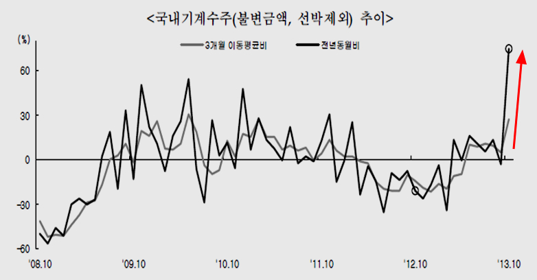 설비투자는 전월비 19.3%. 전년 동월비 14.2%가 상승하였고, 국내 기계수주는 무려 전년 동기 대비 74.4%로 폭발적으로 증가하고 있다.