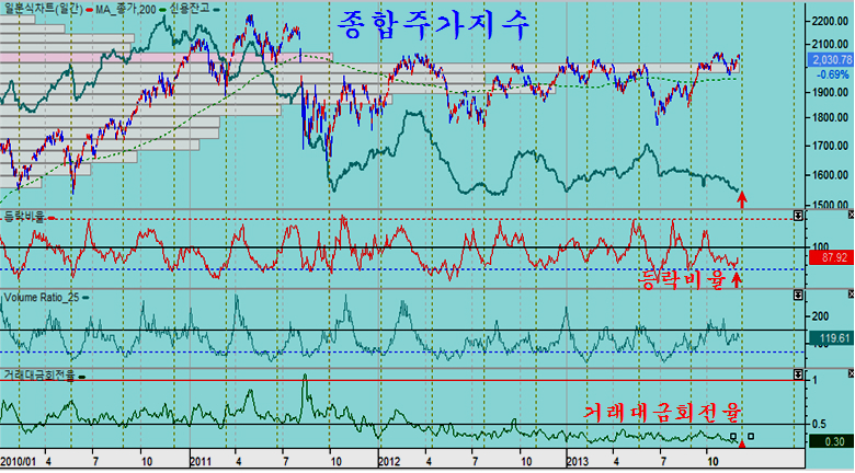 지수와 함께 등락비율과 거래대금 회전율이 중기 바닥권에 위치하고 있어 전반적으로 상승종목이 증가하는 상승 국면이 전개되는 시기이다. 2004년 연말과 비슷한 움직임으로 가기 쉬운 국면으로 대형우량주와 함께 중소 실적 우량기업 모두 적극 매수권이라 할 수 있다. \