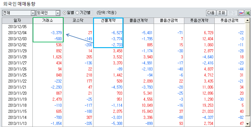 외국인들이 선물시장에서 먼저 매도포지션을 구축한후 4일 현물에 대하여도 순매도를 강화하는 모습이어서 향후 선물시장에 대한 매매포지션과 현물시장에 대한 연계 매매에 대하여 주의 깊게 살펴 볼 필요가 있다.