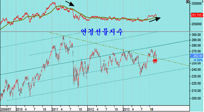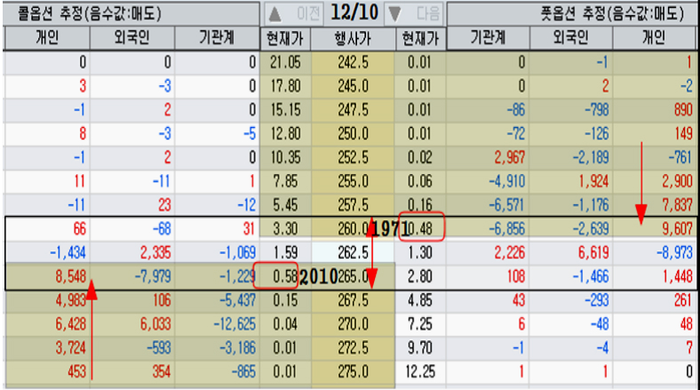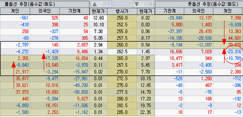 옵션 만기 주간이 되면서 지수가 다시 지수가 옵션 시장에 붙들리는 국면이 되었다. 오늘은 개인이 265 이상의 콜옵션과 260 이하의 풋옵션 매수에 강한 베팅을 함에 따라 지수는 1971에 해당하는 260과 2010에 해당하는 265에 사이에 갇혔다. 한편 262.5 행사가 풋옵션 매도가 증가하면서 지수의 중심은 다소 아래쪽으로 치우치는 변화를 나타냈다.