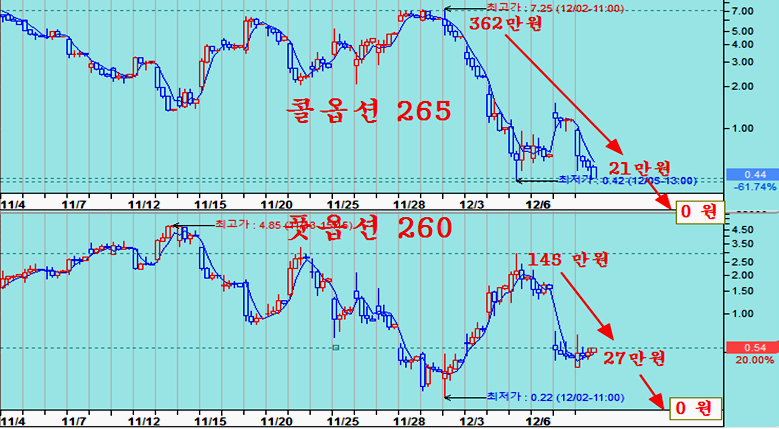 개인이 하루 수천 계약씩 매수하는 외가격 콜옵션과 풋옵션은 시간이 지남에 따라 그 가격치 빠르게 소멸되고 있지만, 개인은 요행히 수익을 얻어 볼 욕심으로 베팅을 늘리고 있고, 이와 같은 베팅이 증가하면서 지수가 아래로는 물론 위로도 움직일 공간이 제한되고 있다.