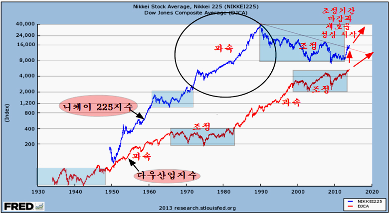 일본 증시의 조정을 주가가 장기적으로 상승을 하지 않는 예외로 거론하지만, 과거 주가를 보면 일본 증시가 장기간 과속 상승한 데 따른 조정 차원으로 20여 년 가까운 조정을 보인 것이다. 이 모습은 다우지수에서도 확연이 나타난다 수십년 과속 상승한 후에는 대략 15년 이상의 장기 조정 국면이 나타나고 이후 다시 가파른 상승이 이어지는 과정이 반복이 된다. 니케이 지수는 이제 조정 구간이 끝나면서 니케이 지수도 20년 저항을 돌파하며 새로운 초대세의 상승 추세가 시작되고 있다.