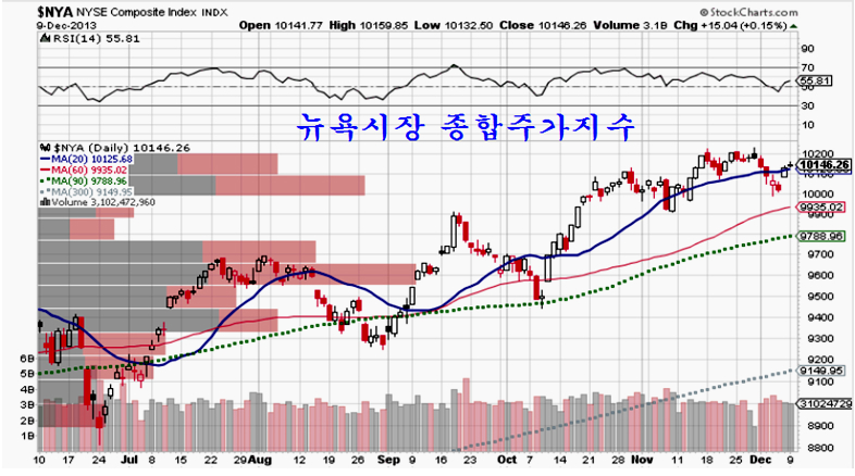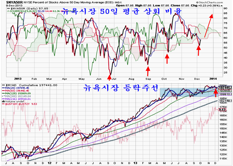 고점처럼 보이는 지금도 시장은 이미 10월 하순부터 상당한 기간을 거쳐 조정을 받음으로써 다시 상승의 위치에 있다. 뉴욕시장에서 50일 평균을 넘어선 종목의 비율과 상승종목수를 더한 등락주선은 장기 조정 후의 바닥권을 보여 시장의 상승 추세가 계속됨을 보여 준다.