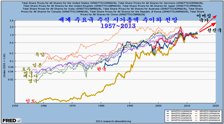 따라서 미래의 주가는 다음과 같이 선진국이 가는 속도와 이머징국가가 가는 속도가 다소 다르게 나타나게 된다.