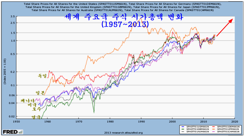 다음은 1956년 이후 지금까지 57년간 미국, 영국, 독일, 캐나다, 호주, 일본의 주식 시가총액 변화이다. 주가가 오르는 도중 20년의 한도 내에서 정체나 조정의 경우가 있지만 결국은 평균으로는 꾸준히 오른다.