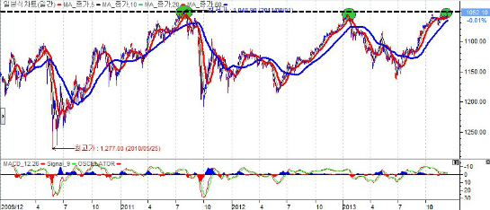 원/달러 환율은 2011년 8월과 2013년 1월의 고점인 1050원대에 이르렀다. 차트에 보면 알 수 있듯이 누구나 고점에 대한 인식이 팽배해 질 수 있는 가격대라는 것이다. 따라서 외국인들은 원화를 팔고 달러를 사는 환차익이 발생할 수 있는 자리이며 원화를 판다는 이야기는 국내증시에서 자금을 빼내 간다는 의미이기도 하다. 이것으로 외국인이 국내 증시에서 일탈하고 있다는 이야기를 하자는 것은 아니다. 다만 증시가 상승하기 위해서는 절대적으로 외국인의 자금이 필요한 상황에서 외국인이 이탈하고 있다는 것은 국내 증시를 끌어 올릴만한 자금의 부재현상이 지속될 가능성이 있다고 말하고 싶은 것이다. 따라서 외국인의 자금이 유입되기 위해서는 국내 환율의 안정이 무엇보다도 필요하며 원화강세가 지속된다면 외국인 자금의 유입문제뿐만 아니라 국내 경제성장률에도 부정적일 수밖에 없다.