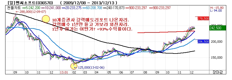 지난 년초인 2월6일 무려 10여개 증권사에서 엔씨소프트에 대하여 매도의견을 제시하였다. 그날 주가는 폭락하였다. 공개적으로 그 주식 받으라고 했다. 동일 방송에 출연한 모든 전문가들도 매도의견을 제시하였다. 필자는 동일 야간공개방송을 하면서 딱 이종목 특별히 언급하였다. 매수해서 눈.귀 다 막고 신문도 보지말고 1년만 들고 가보라고...1년이 안되었다. 당시 주가는 125,000원이고 현재의 주가는 24만원대이다. 대략 +100%상승하였다. 누구 말이 맞은가? 필자의 방송을 들은 수백명의 인원이 있기에 필자는 단 한치도 보태거나 빼서 얘기하는 것이아니라는 사실을 당시 당송을 들은 모든 팍스회원님이 증인이다. 필자의 강의를 들은 적이 있고, 기억하시는 분은 추천 꾹~